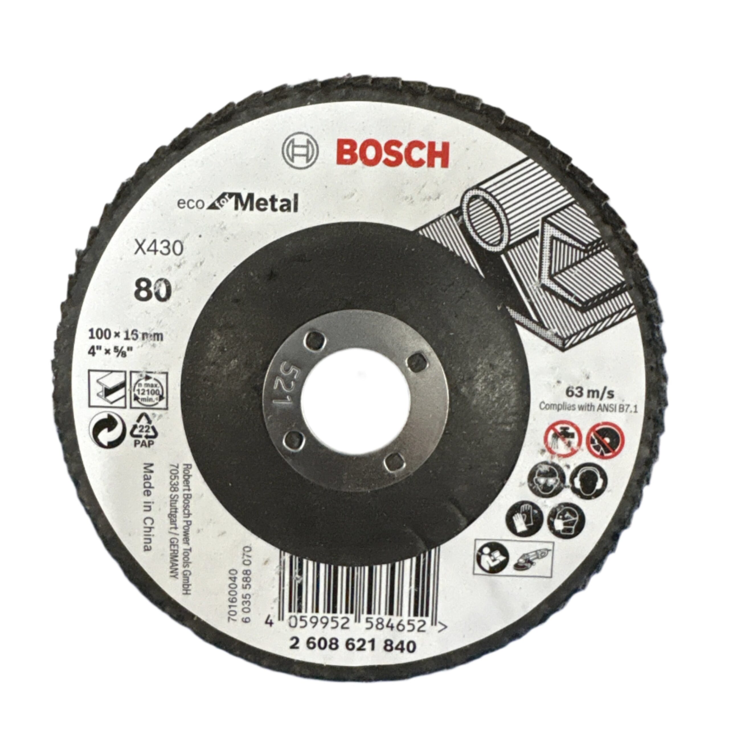 Bosch 2608621840 Flap Disc (100mm, 80 Grit) is built for efficient material removal and surface finishing on metal. Featuring high-quality aluminum oxide abrasive and a strong fiberglass backing, this 4-inch flap disc is ideal for grinding, deburring, and blending welds, offering both durability and consistent performance.